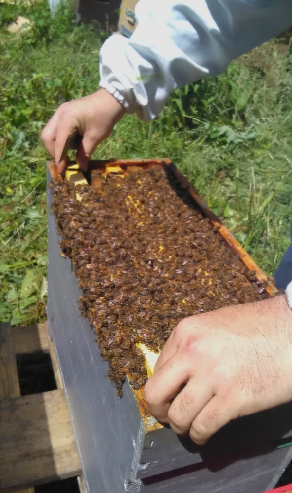 Essaims de l'année, sur 5 cardes, 3 cadres de couvain+ 2 cadres de provisions. Les reines 2026 sélectionnées. Traitées contre le varois, hors couvain.