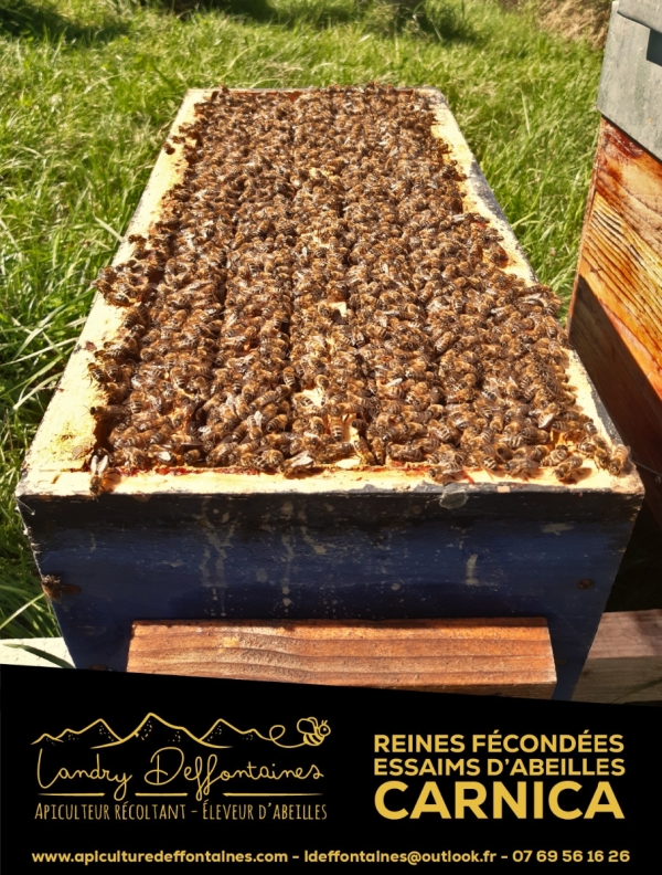 Essaims Carnica de printemps sur 4 cadres Dadant dont 3 de couvain.