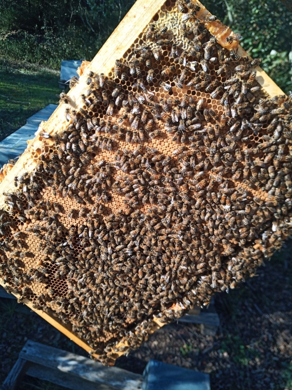 Sur 5 cadres Dadant, 3-4 couvain. Certifié Bio. Une vingtaine disponibles.