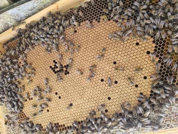 Sur 5 cadres dont 3 cadres de couvain, 1 cadre de réserve, 1 cadre de transition.