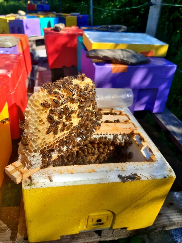 Élevage sur souches F0 issues de sélectionneurs européens spécialisés Carnica (LAVES, AGT, APIESM). Sélection sur la rusticité, la douceur, la faible tendance à l’essaimage et la productivité. Fécondation dirigée, voie mâle sélectionnée sur l'exploitation.