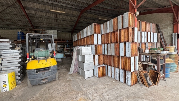 Un stock conséquent est inclus : corps de ruches, hausses, nourrisseurs, toits, cadres et équipements divers.