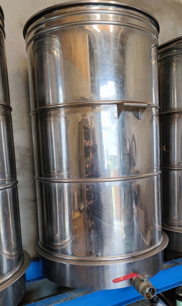 Lot de 5 maturateurs inox, 500 kg chacun, avec fond incliné et vanne quart de tour.