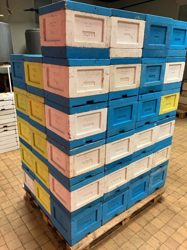 - 68 nucléis Miniplus peints – polystyrène avec toit couvercle, corps, plateau aération et plaque isolante de fond : 14 €/pièce soit 952 €.