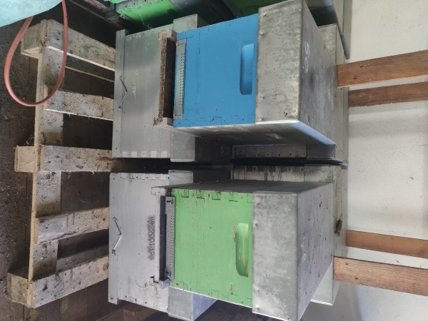 Vends une cinquantaine de ruchettes dadan à tenons bandes lisses 6 cardes. Avec nourrisseur couvre cadres bois , toit tole 105 cm et cadres off man à passer à la soude