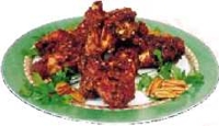 Porter l’huile de friture à 180°C et frire la moitié des ailerons panés pendant 10 à 12 mn en les retournant délicatement. Déposer les ailerons frits sur une assiette recouverte de papier absorbant que vous réserverez au chaud dans le four. Faire frire le reste de la même manière. Décorer de persil et des noix entières.