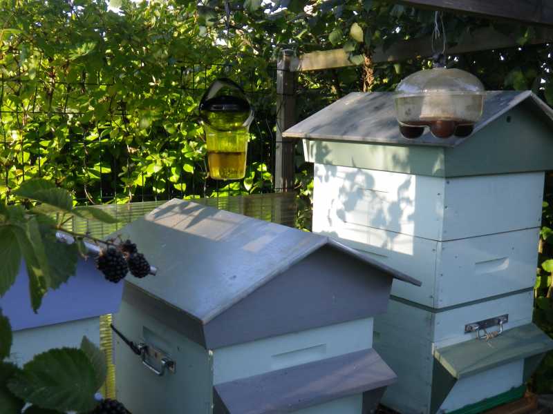 Cf photo pour le "protocole" : même rucher, m^me hauteur (2 mètres) pour ceux au-dessus des ruches, pareil en dessous des ruches. Dans les cloches non véto, mélange bière brune + sirop de cassis.