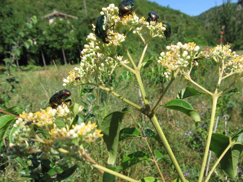 On dirait bien que se sont des Cétoines, sur les fleurs d'Evodia. Ces scarabées lorsqu’ils peuvent pénétrer dans les ruches font du dégât sur les rayons surtout au printemps.