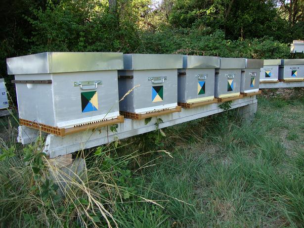 Effectivement ce sont des éléments de maçonnerie détournés, ce sont des éléments qui servent à faire les "planchers" avec les "marmites" entre les pannes et le béton coulé par dessus. C'était la première installation, depuis j'ai opté pour des longeurs de 2,70 m ce qui permet de faire des "bancs" de 5 ruches Dadant 10 cadres, avec 2 moellons pleins pour chaque pieds, plus de problème de mal au dos.