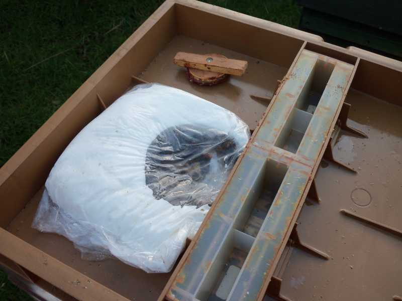 Nourrisseurs posés à l'envers sur les ruchettes, pour laisser la place au pain de candi, c'était il y a longtemps, sans les plaques transparentes. Le démarrage au printemps était plutôt violent, les abeilles sont passés au-dessus du sachet vide du candi et se sont installés au-dessus. Bonjour l'angoisse pour récupérer la reine, depuis, plaque transparente et visite moins espacées.