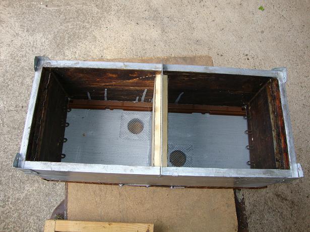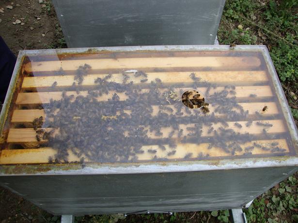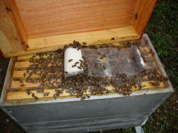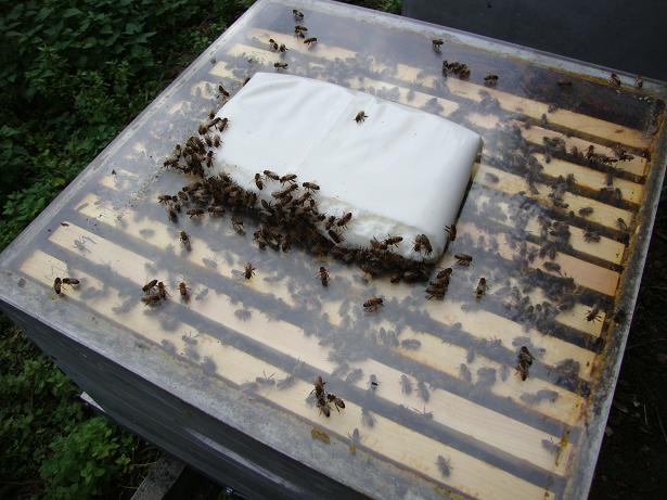 Donc, pour les nuclèis, 5c, 6c, 7c et 12c, comme il n'existe pas de nourrisseur plastique, j'ai fais couper des plaques d'altuglas au dimensions des "caisses", avec un trou de 40mm environ, et donc le candi est positionné sur le trou ET là le nourrisseur est remis à l'envers, ce qui permet, en soulevant légèrement le nourrisseur de voir même les abeilles circuler, et donc de re nourrir sans problème en cours d'hiver. (j'ai aussi des photos, mais c'est un peu de b.... dans mes fichiers, faut que je remette la main dessus).