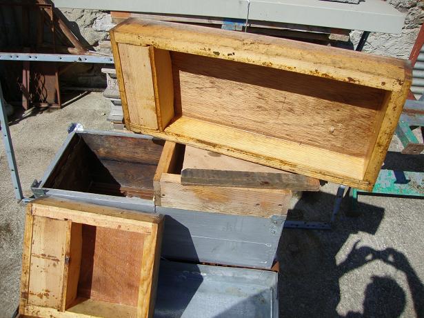 Comme je ne suis pas trop bricoleur, et après beaucoup de déception avec les nucléis polystyrène, je suis passé au bois, mais en utilisant des éléments standard du commerce, c'est la deuxième version. Les cadres sont des cadres de hausses Dadant coupés en deux, les corps sont des haussettes de 5 cadres, donc il y a 5 demi cadres de chaque côtés. Les nourrisseurs sont des standard 5 cadres recoupés. Les colonies sont donc 2 par 2, dos à dos, c'est mieux pour l'hiver, seulement 3 côtés extérieurs. Ils sont superposables, je les assembles 2 par 2 pour l'hiver chaque reine est donc sur 10 demi cadres. C'est plus satble, plus facile à porter. Couvre cadres et toits sont on ne peux plus standard.