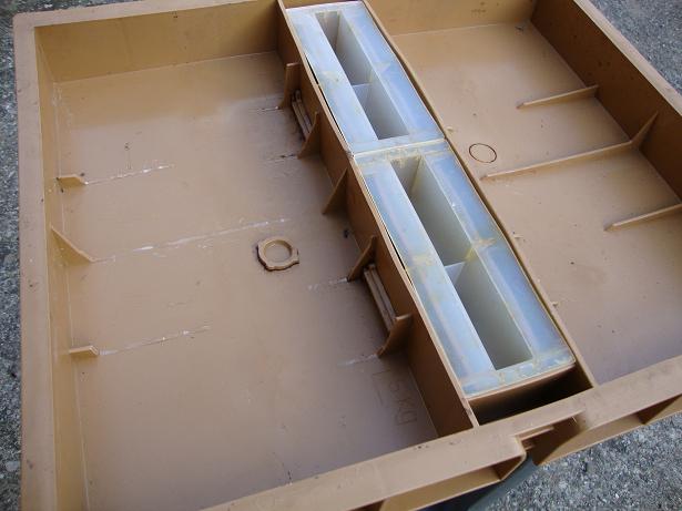 Photo du nourrisseur NICOT avec un compartiment ayant les renforts arasés pour permettre au "sac" de candi de plaquer au fond, pas de courant d'air. Attention aux doigts je découpe les renforts au cutter, je déconseille, sauf aux manuels.