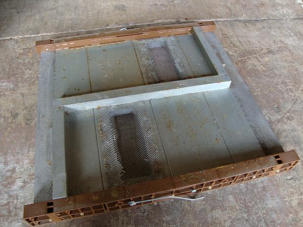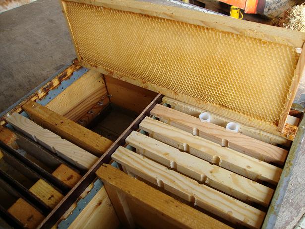 Le détail intérieur de la "cloison" de séparation, le cadre de hausse est juste là pour bien montrer que ce sont bien des cadres de hausses coupés en 2.