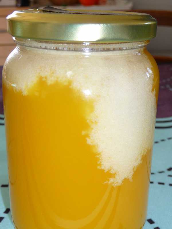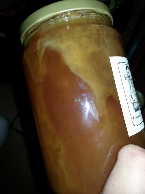 Un mois plus tard il a cristallisé et aujourd'hui il est marbré: une couche figé, 1couche liquide. La granulométrie est grossière, il est pas joli à voir mais bon, il a quand même gardé ça, si si