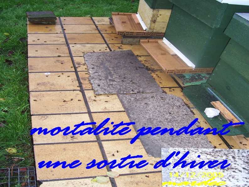 de toute facon en cas de mortalité devant les ruches il faut toujours vérifier qu'il s'agit bien d'abeilles adultes en bon etat et en assez faible nombre (mais pouvant atteindre une centaine en cette période de froid) Dans tout les autres cas (abeilles noires sans ailes, nymphes ou momies, abeilles en grand nombre, etc) il faut s'inquiéter mais la les causes sont nombreuses!