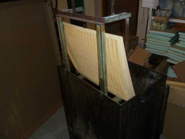 Après un grattage minutieux tout le matériel supportant la chaleur doit être passé à la flamme d’un chalumeau (genre camping gaz ou chalumeau de brasage, l’idéal serait d’obtenir une grosse flamme pour les grandes surfaces et une flamme fine pour les rainures et les bandes d’espacements ) on insistera dans les angles, les bandes d’espacements, la rainure des cadres ( sans cire ), pour achever le travail, un deuxième grattage ou un brossage à la brosse métallique ôtera les résidus du brûlage, le bois doit avoir la couleur « pain brûlé » en fin d’opération. La chaleur d’un four peut également être utilisée. Il faut soumettre le matériel a 130° pendant 30 minutes.