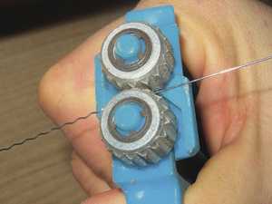 Pas besoin de pince ou serre joint pour filer tes cadres, tu file à la main en serrant bien tout de même. La 3e main c'est la roulette zigzag qui va gauffrer ton fil et ainsi le tendre d'advantage.