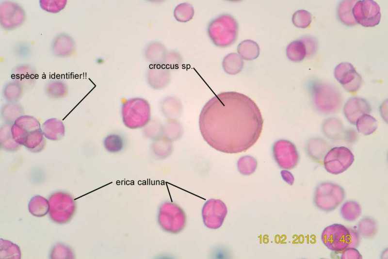 En tout cas aucune confusion possible avec le noisetier, le gui ; les perce-neiges, croccus ; sarccococa et hélleborus ; leur pollen est très caractéristique et n'a rien à voir avec ce type observé (je mettrais les photos des que possible) ; donc je vais chercher autour de chez moi pour découvrir cette espèce florale qui m'interpelle.......