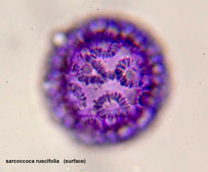 Sarcococca a une structure très caractéristique impossible à confondre ;et Hélleborus a une surface très structuré, des pores très larges et est plus gros en taille ;
