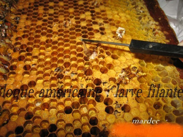 J'ai trouvé seulement une cellule operculée au milieu de quelques autre avec des abeilles morte sous l'opercule, j'ai plongé une brindille dans cette cellule, il en est sorti un amas marron visqueux mais NON filant, même aprés l'avoir trituré.