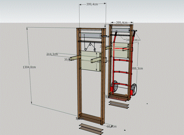 Je crois que tu as un probléme d'echelle ou d'unité sur tes plans. Il te faut un immense garage pour garer ça: 13 m de haut 3.99 m de large. Je comprend pourquoi il te faut des poulies pour réduire l'effort. On dirait les dimension d'un char du carnaval de RIO.