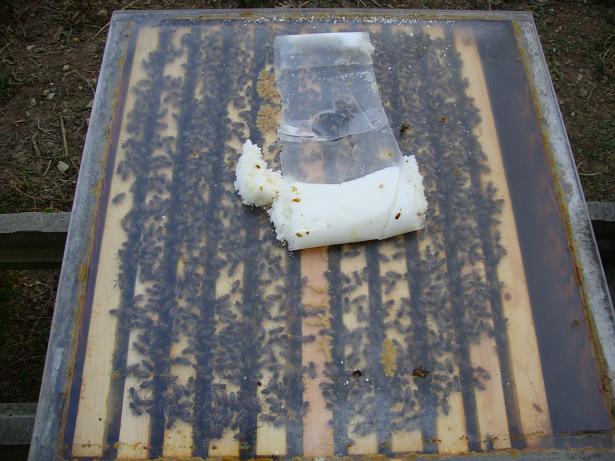 C'est pourquoi je préfère mettre le "plexis" en couvre cadres, avec un trou de 50 mm, ce qui me permet de ne pas perturber le "dessus" de la grappe, de pouvoir contrôler facilement en hiver la conso. de candi, et d'éventuellement remettre un "pain" en période froide. La hauteur disponible au-dessus des têtes de cadres ne permet que le passage d'une abeille, le candi ne se trouve donc pas "éloigné" des abeilles.