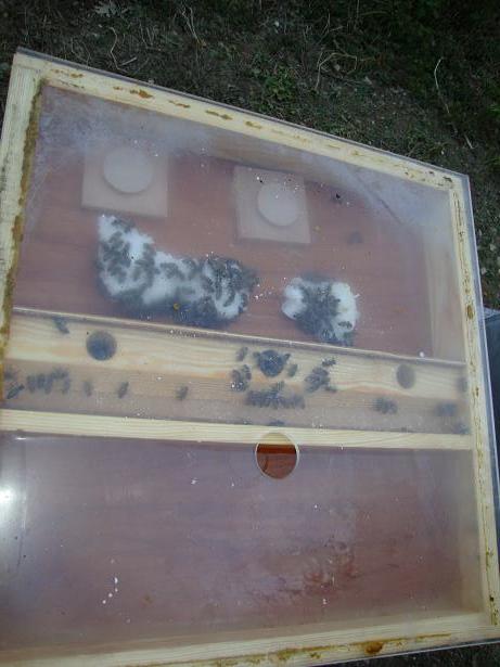 Bin voilà, j'ai pas osé visiter, j'ai par contre ouvert, retiré le plexis et le restant de candi, installé le nouveau nourrisseur avec 3kg de sirop, le candi repositionné à l'avant, le plexis remis en plaque de fermeture du nourrisseur, ce qui permet de les voir s'activer sans courant d'air. Visiblement elles sont plus accros au candi, le sirop ne semble pas encore les passionner. S'il pouvait encore y avoir une plaque de plexis en fond du nourrisseur du côté cadi, ce serait le TOP, puisqu'il serait possible de voir les têtes de cadre, ce sera la prochaine modif.