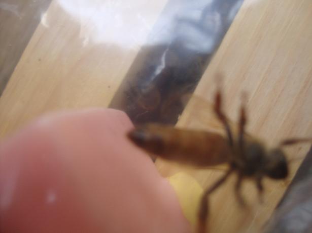 Bin non, sur la photo suivante, qui a été prise qlq secondes avant les autres, elle cherchait les alvéoles à pondre, et donc sur cette photo on dirait qu'il y a trois varroa, un par section de l’abdomen. En fait c'est sa forme, couleur, flash, reflets qui donnent cette impression. Mais vos observations sont les bienvenues. Comme dirait Pierrot, je pars du principe, que les prochaines de photo, de cette dame, on ne peut plus dire demoiselle, seront dans une semaine.