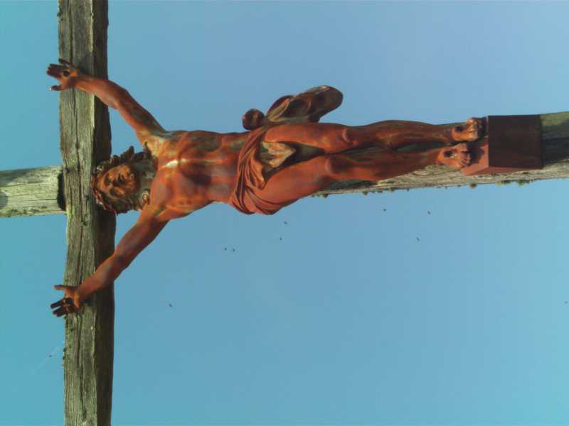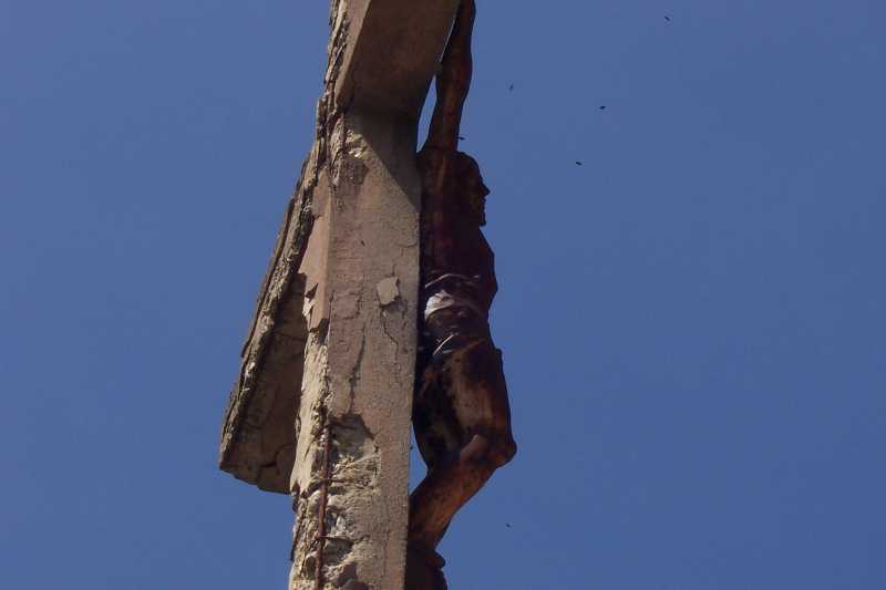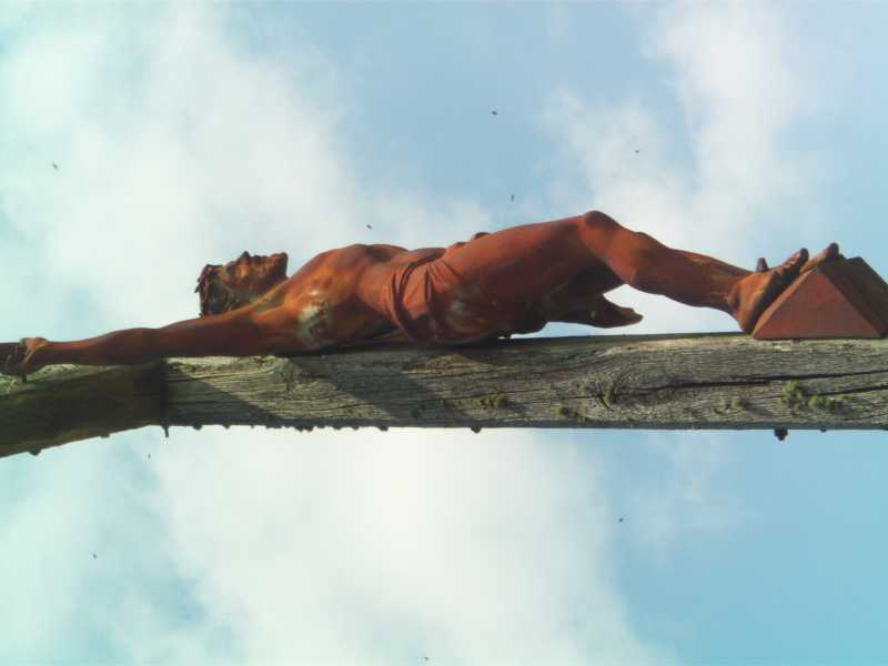 il on mis un piton au trou de balle pour fixer la statue a la croix et elles rentrent par la .