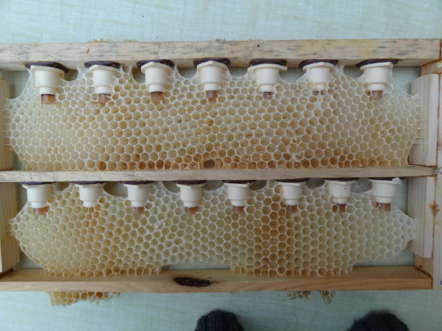 Si j'ai bien compris, 14 cupules par barrette, 2 barrettes par cadres?, 2 cadres par éleveuses? soit 56 cupules par éleveuses? Tu utilises des cadres avec nourrisseur incorporé? Nourrissement au miel?