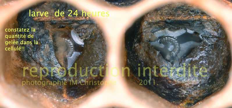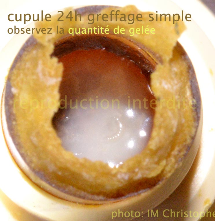 Or une larve de 24h a DEJA été nourrie de gelée royale dans le but d'être au final une OUVRIERE (d'ailleurs si vous regardez mes photos on peut voir la difference quantitative de GR pour une larve d'ouvrière de 24h comparée à la quantité de GR dans une cupule de 24h destinée a produire une reine.
