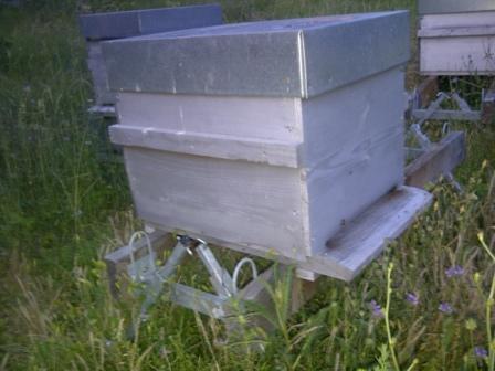 l'idée serait de faire un support pour 3 ruches (donc assez lourd et encombrant pour ne pas être facilement transportable), une structure en métal, genre banc, mais avec un système de barre au dessus des toits, verrouillée et cadenassée, empechant une ouverture des ruches sans difficultés...
