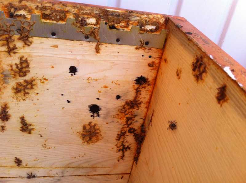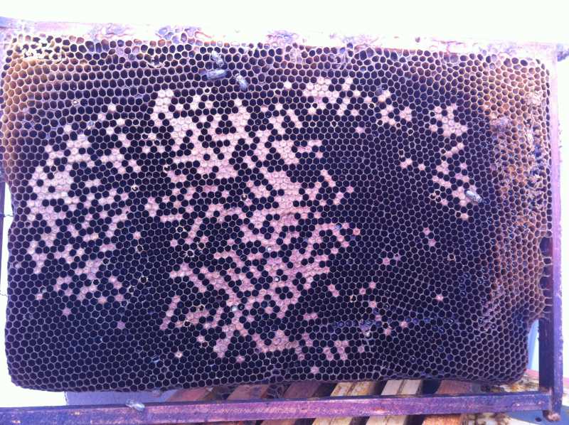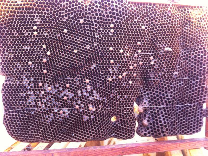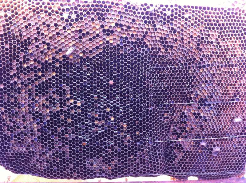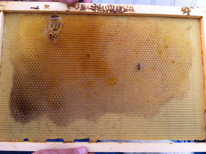 Les taches noire c'est l'enfumoire il y a eu du goudron avec de l'eau "condensation" qui a éclobousé. Pour le reste je pense que la reine est foutu. Sans changement de reine et s'il reste assez d'abeilles la ruches est condamnée, moi dans ce cas je supprime la reine, met une ruche avec de beaux cadres bati ou gaufrée dans une ruchette que je met a la place de la ruche et je secoue tous le monde devant la ruchette, ensuite (sirop sirop) introduction de reine fécondé et toujours sirop. Mais il faut qu'il reste au moin 4 ou 5 cadres couvert d'abeilles.