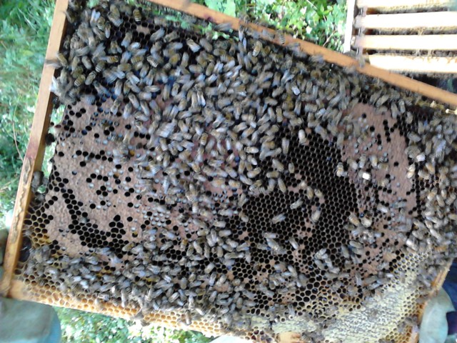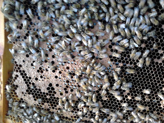 Pourtant la ruche est relativement populeuse, rentre du pollen et n'a pas l'air de nettoyer ces cellules. La reine date de l'année dernière.