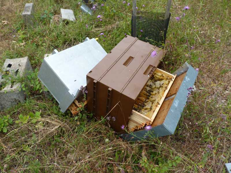 20 ruches renversées sur 25 avec la chaleur et la grosse rentrée de nectar cire fondue abeilles engluées dans le miel je ne sais pas combien je vais en sauver mais qui peut faire ça!!!!!!moral dans les chaussettes.