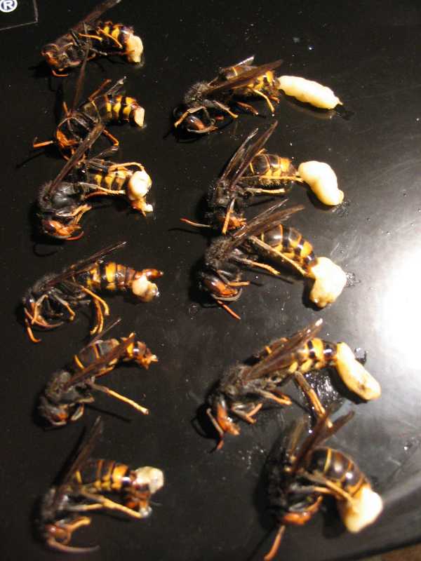 En fin d’été, le frelon asiatique exerce une pression importante sur les ruches, son besoin en protéine étant proportionnel au développement de la colonie. Depuis trois ans que je conduis cette expérience, le frelon asiatique ne représente plus pour mon rucher qu’un épiphénomène parfaitement négligeable. En revanche, je trouve particulièrement intéressant le complément alimentaire qu’il constitue pour mes poulets.