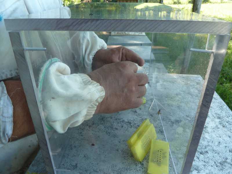 Une sutre manière de faire est de tremper quelques secondes la cagette coté abeilles, pas candi, dans un verre d'eau. L'eau empêche un petit moment les abeilles de voler, on a donc le temps de l'ouvrir, enlever les accompagnatrices et laisser la reine.