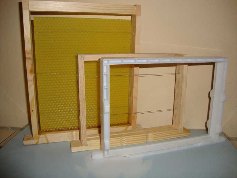 Et voilà le résultat, sur la même photo, en plastique blanc le cadron type Mini+, en suivant le "vrai" demi cadre de hausse Dadant, puis enfin le modèle qui devrait pouvoir me permettre d'hiverner sans trop de perte, des reines. Le nouveau modèle fait 50% de plus de surface intérieure que le 1/2 cadre de hausse.