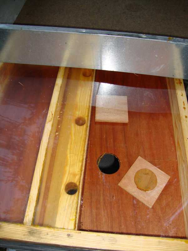 Pour l'hiver, j'ajoute une plaque de polycarbonate, percée, le nourrisseur à l'envers permet de recevoir un bloc de candi. Donc possibilité de contrôler la conso. hivernale, éventuellement de "recharger", sans écraser les abeilles sur les têtes de cadres.