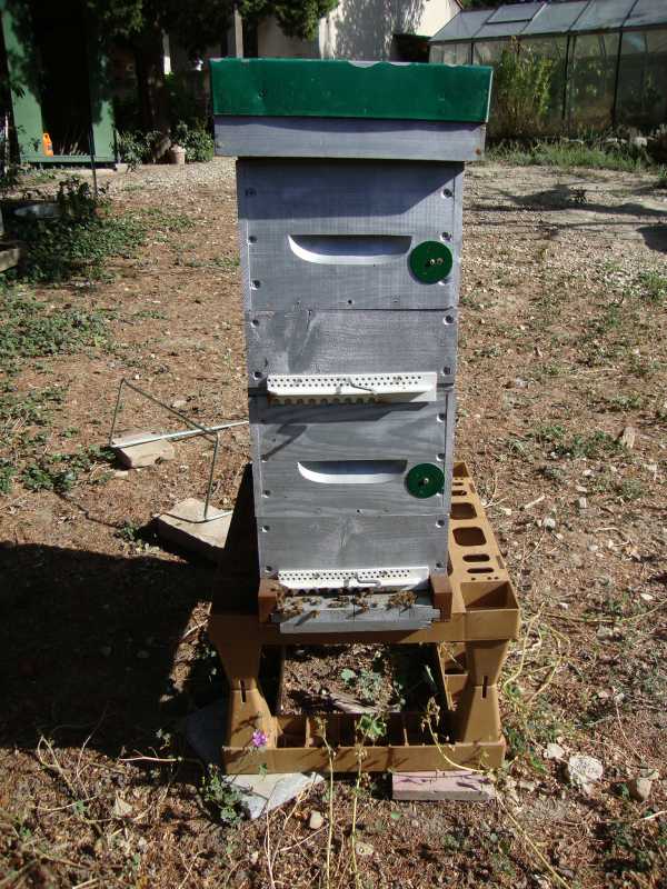 Alors, l'avant de la ruche est à droite, le compartiment de droite est pour le candi, il y a la possibilité de 2 ouvertures (pour être sûr de chopper la grappe), au milieu, il y a 3 cheminées pour faire monter les abeilles pour la prise du sirop, qui est à gauche, c'est à dire à l'arrière de la ruche. Le nourrisseur est recouvert d'un PVC transparent, ce qui permet de soulever le toit à n'importe quel moment de l'année. Le toit est en face, à l'envers, en bois recouvert de tôle, et à l’intérieur une plaque de phaltex. C'EST LE TOP!!! Pas de défaut! A part le prix et le poids, enfin ça fait déjà 2 (de défauts!) :woohoo:
