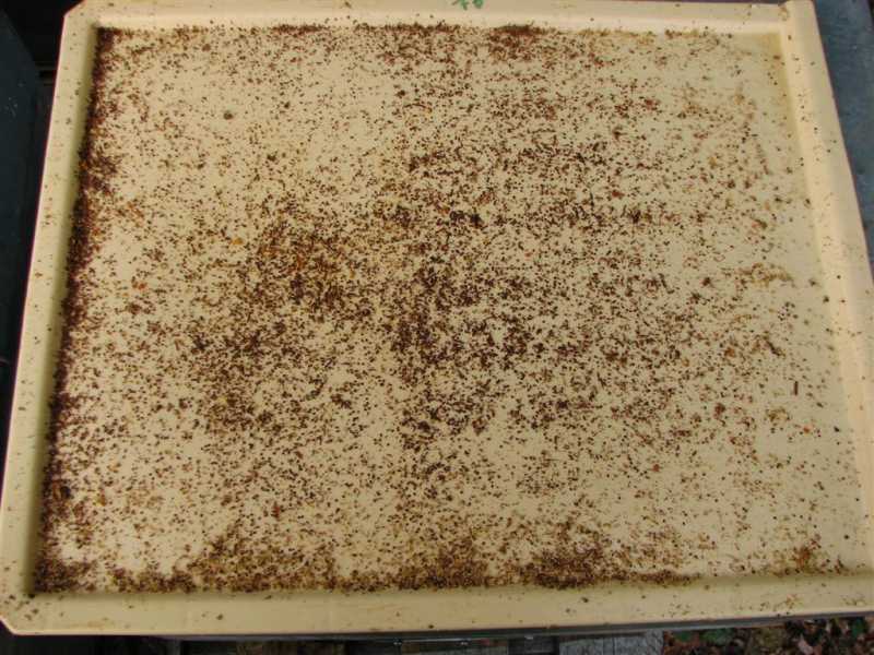 Une petite photo bonus d'une belle fricassée de varroa, 9 jours de chutes suite à un traitement hors AMM (j'ai trop peur d'une résistance à l'AMM, mouarff).