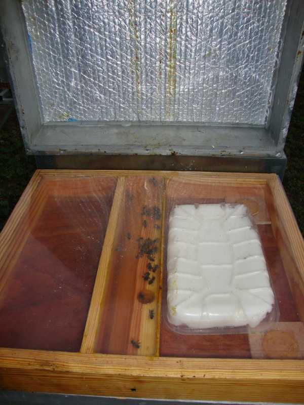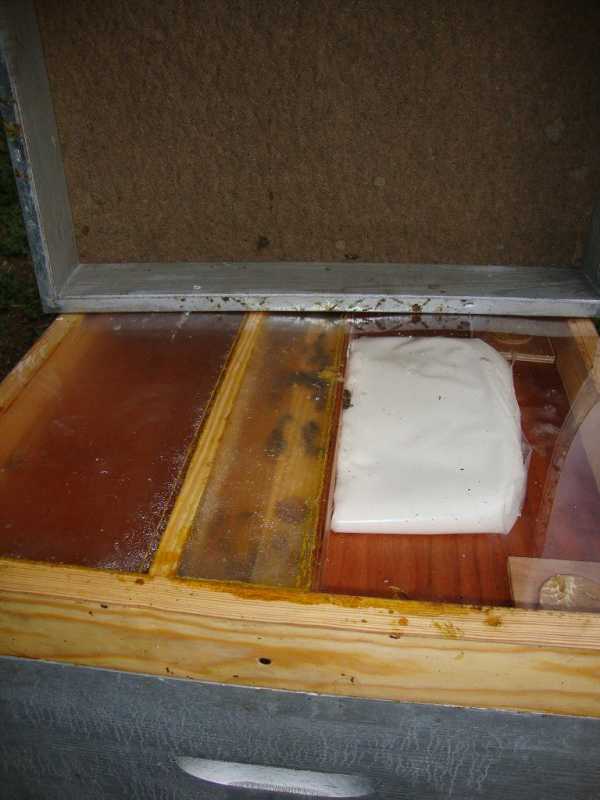 Nourrisseur en bois, "cheminées" centrales, loin du bord du ruche, donc facile d’accès, l'avant est à droite, avec la réserve de candi, à gauche le compartiment sirop pour le printemps, recouverts d'une feuille mince transparente ou Topclair, à l'intérieur des toits, la 12c Phaltex, la 10c Apichaud, c'est à dire l'alubulles dans une "poche" plastique fermée.