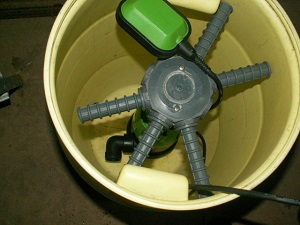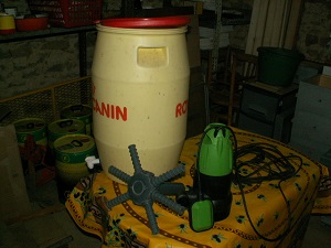 Dans ce système tout est de la récup, la barre plastique qui bloque la pompe au fond du fût en position verticale aussi. Je déclenche la pompe soit en montant le niveau de l'eau, soit en posant le flotteur sur la barre plastique.