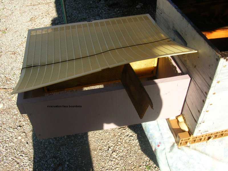 En fait j'utilise des morceaux de grilles à reines coupé qui me servent de "portière" et que je met en fin de miellée de colza environs 10 jours avant récolte sur les ruche de "production" seulement!