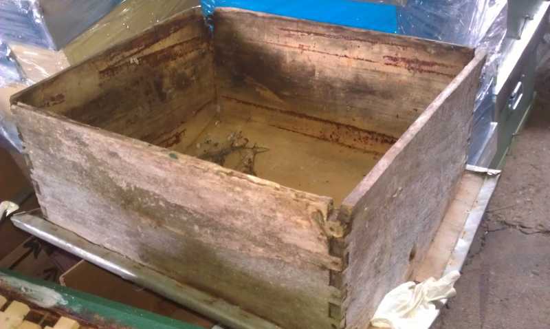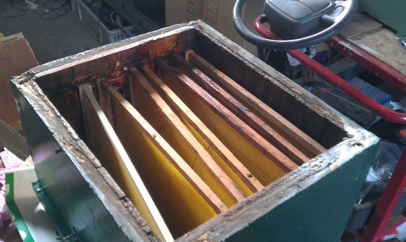 j'ai récupérer le même type de ruche il y a peut d'après le petit vieux aucune visite depuis 5 ans, une block de propolis...de plus c'était un corp de 12 cadres avec seulement 11 cadres (c'est courant chez moi ?!) et pas de cire gaufrées pour guider les abeilles, des constructions anarchique partout dedans...un vrai bordel !!!