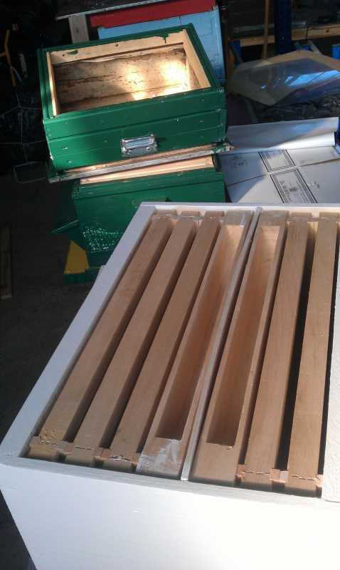 j'ai des ruchettes sur mesures, avec 2 compartiments. un de 4 cadres et un de 3 cadres. la séparation est amovible et cela peut devenir une 7 cadres hoffman ou une 7cadres hoffman + 1 cadre droit soit dans ce cas nue 8 cadres.
