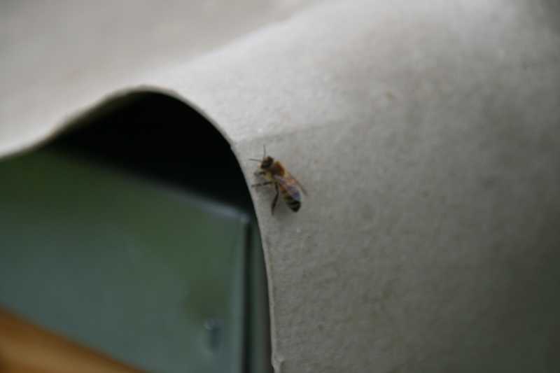 48H après j'ai encore beaucoup d'abeilles qui tournent a l'emplacement où était la ruchette. N'ayant plus de caisse ni ruchette j'y ai mis un carton vide avec une ouverture pour voir ce que çà donne. J'y ai passé un coup de flamme rapide et fondu quelques petits morceaux de cire, frotté quelques feuilles de mélisse et puis fermé tout çà. Ce soir vers 19H30 (carton placé vers 15h) il y a plus d'une dizaine d'abeilles qui entrent et sortent du carton "vide".