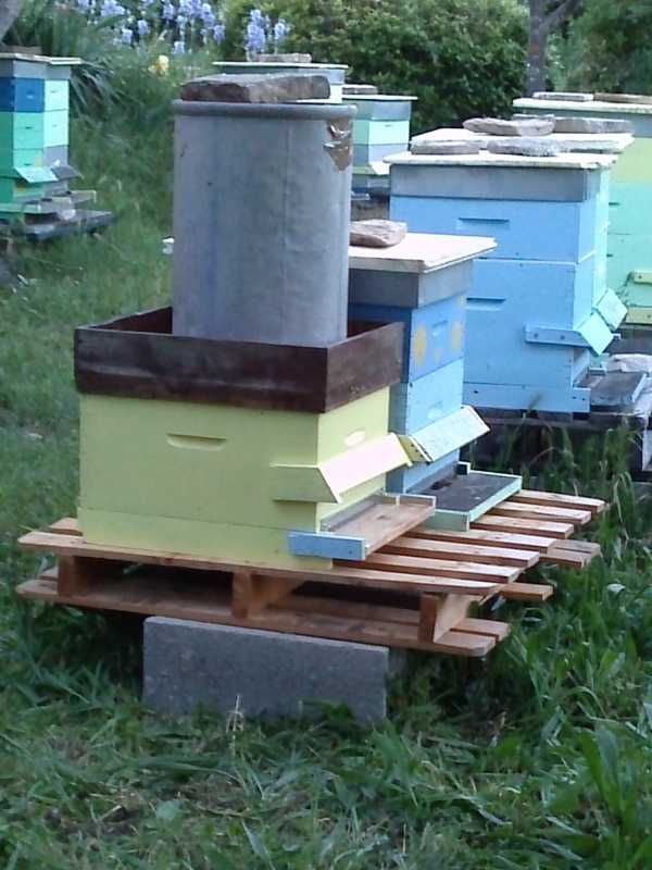 Appel en fin de soirée pour un essaim sous un banc au fond d'un jardin : il est là depuis quand ? Oh, depuis midi, on attendait qu'elles dorment pour vous appeler. Le banc est une planche juste posée sur deux bidons dans les broussailles, il suffit de la soulever et de secouer l'essaim dans la ruche d'accueil ... oui, sauf que, quand on a déplacé la planche, ce n'est pas du tout un essaim, c'est une colonie qui est là depuis au moins un mois (à en juger aux constructions), et quand tu te retrouves, avec ton aide, chacun à un bout d'une planche que tu ne peux pas reposer (à cause des broussailles) sous laquelle il y a une belle colonie moyennement heureuse de son déplacement aérien (ça tourbillonne pas mal autour de nous), et pas du tout disposée à lâcher ses cadres sauvages pleins de miel et de couvain, il faut réfléchir, et vite, aux actions possibles. Comme on dit "le vin est tiré, il faut le boire". Finalement on a posé la planche de chant sur la ruche, découpé les cadres sauvages à la base avec un fil de fer (oui, parcequ'on était sans matériel, on a pris ce qu'on trouvait sur place), plus ou moins arrangé tout ça dans la ruche dont on a enlevé la moitié des cadres, refermé, et on ne s'est même pas fait piquer. Cette année, cette colonie est une de mes plus florissantes (et cela va sans dire, elle est très douce). Au même endroit, j'ai récupéré ce printemps un autre essaim, cette fois installé dans un bidon (heureusement sans fond). Le bidon est maintenant posé sur un couvre cadre troué, elle se sont installées dans la ruche sans problème, j'attends que tout le couvain soit né pour virer le bidon. Et j'envisage une ruche piège pour l'an prochain ...