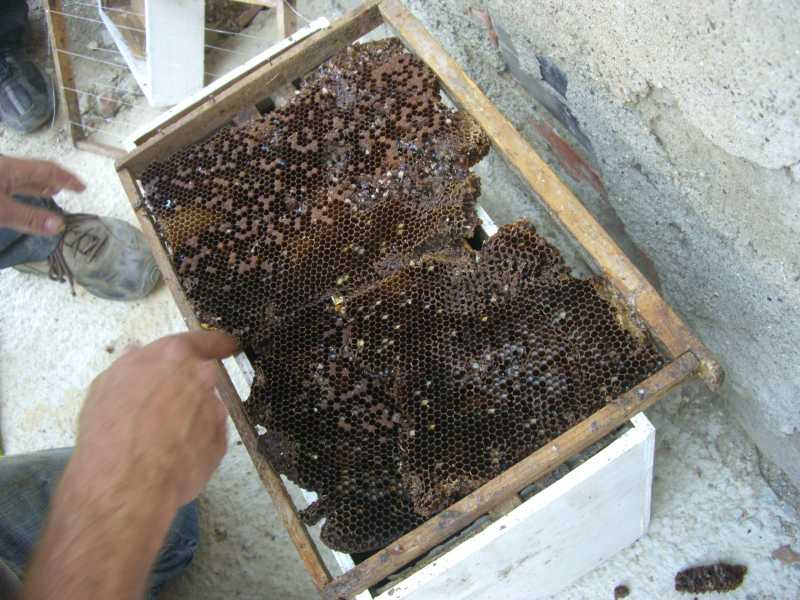 cette colonie a du périr par le passé car dans l'encadrement il y avait de tres vielles constructions toutes sèches et parfois décrochées, mais je n'ai pas vu une fausse teigne ou une abeille victime de notre cher ennemi varoa ..et si ces colonies étaient "résistantes" ce serait un pas vers une solution pour les amateurs ... peu productives mais résistantes .
